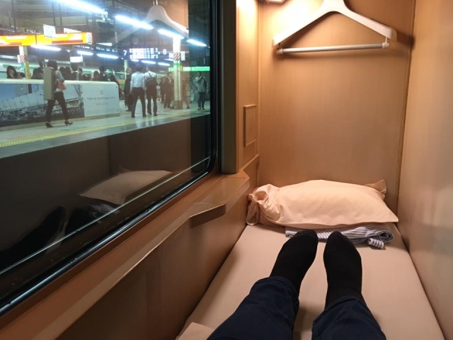 今回利用したのはB寝台。空調が効いており快適な室内です。折り畳み自転車であれば室内に置いても邪魔にはなりませんが、ロードバイクだとかなり手狭になるでしょう。