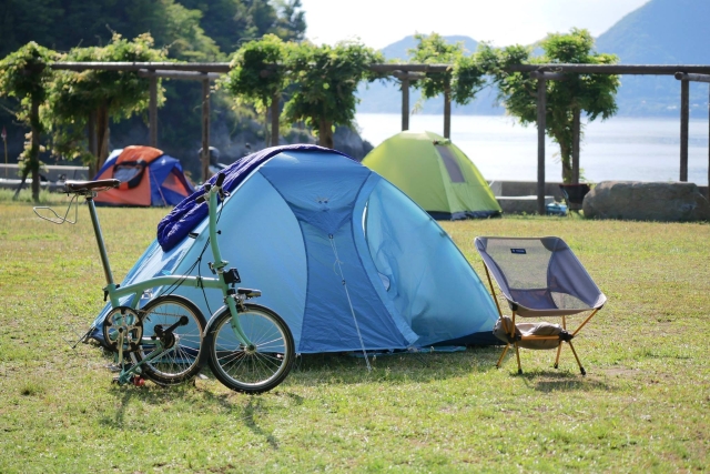 テントを設置してキャンプ用チェアにもたれるとキャンプ特有のゆっくりした時間が流れはじめます。ハンドドリップしたコーヒーがいつもより旨く感じるのはサイクリングのここちよい疲れと美しい景色のせいなんでしょうね。