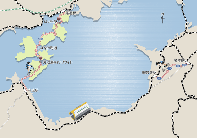 今治駅~国道317号~県道161号~来島海峡大橋~国道317号~伯方・大島大橋~見近島キャンプサイト