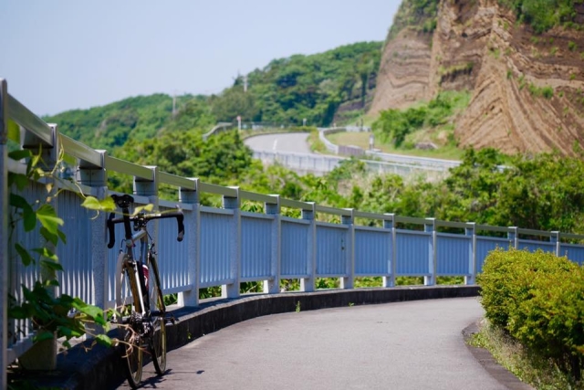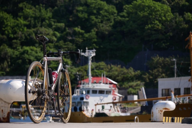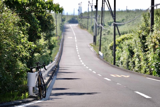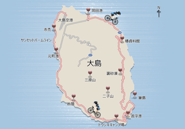 岡田港から大島一周道路まで距離900m、高低差82m、平均斜度9.6%のきつめの坂があり、初心者は脚をついてしまうかもしれません。