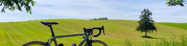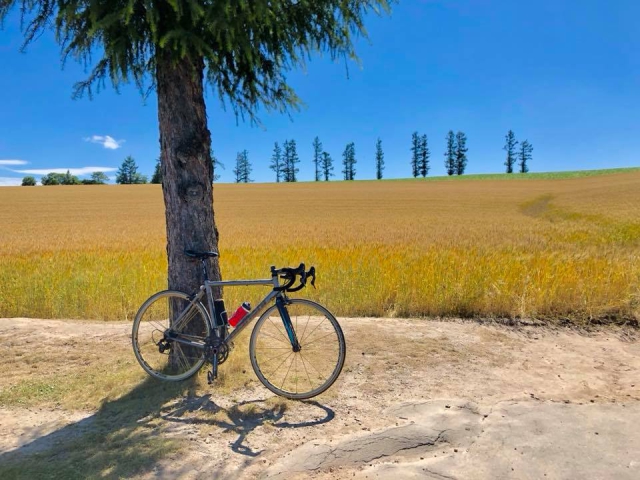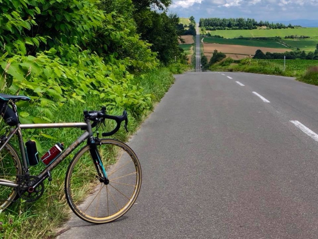 旭川空港から美瑛へはおよそ7km。自走で30分ぐらいだと思います。美瑛から道道580号一時間ほど南に下ると上富良野に到着します。上富良野でもっとも有名なサイクリングスポット言えば、ジェットコースターの路ではないでしょうか。スペクタクルな写真を撮るために丘の頂点まで頑張って走って(押して?)みましょう。