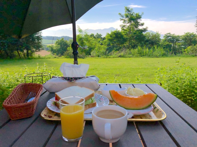 深山峠からさらに30分ほど走り、上富良野市街の北端に位置する宿「コスモスファーム」は富良野をめぐるのにいい拠点になると思います。富良野岳を望みながら食べる朝食は最高です。