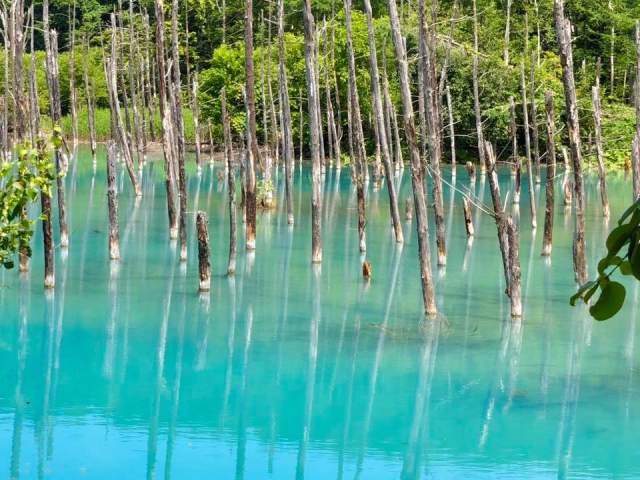 美瑛町に戻ります。十勝岳に通じる道道966号(十勝岳温泉美瑛線)の途中には有名な「青い池」があります。初めての方は一見の価値があります。ロックできる場所がないので自転車を置く場所に困るかもしれません。何人かで行って自転車同士をワイヤー鍵で繋ぐのが安心だと思います。