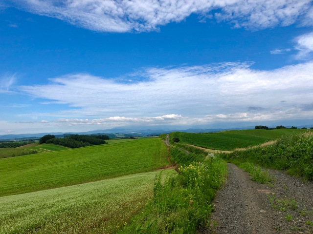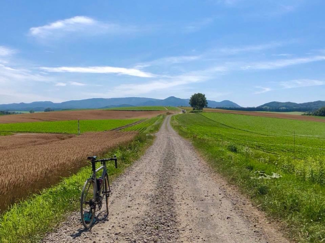 美瑛町から西に行った丘の上に五稜と呼ばれる地域があります。砂利道が続くので、ロードバイクだと気をつけながら進むことになりますが、景色は格別です。7月から8月にかけては牧草ロールが北海道らしい雰囲気を醸しています。